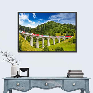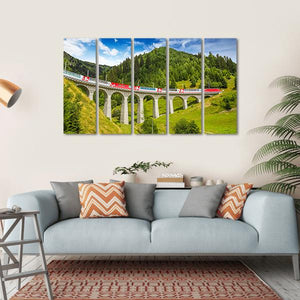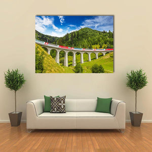 This captivating wall art features a majestic mountain landscape centered around the iconic Landwasser Viaduct in Switzerland, showcasing a vibrant red train crossing the arched stone bridge. The scene is alive with green pine trees and fluffy clouds, creating a scenic and adventurous atmosphere.