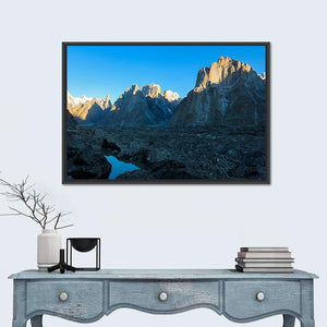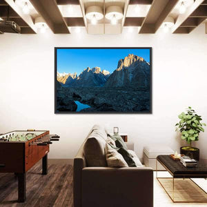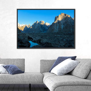Trango Towers and the Baltoro Glacier in Karakorum, Pakistan appear in a wide-angle, realistic landscape of sharp mountain peaks, a dark rocky glacier surface, and reflective water. The blue-gray, white and tan palette and deep perspective create an epic, serene mood that works well in modern home or nature-focused rooms.