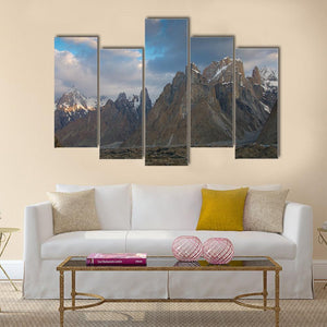 This canvas art captures majestic mountain peaks and rugged rocky terrain beneath a sky filled with dramatic clouds. Its earthy palette of blues, grays, and browns creates an awe-inspiring atmosphere, making it ideal for nature lovers.