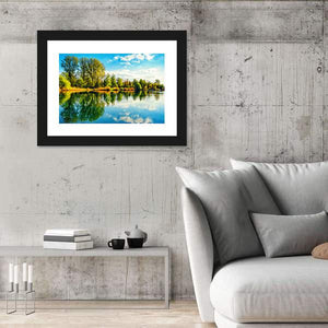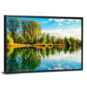 This canvas art captures a serene lake landscape, featuring lush trees, a vibrant blue sky, and soft clouds reflecting in the water. Its tranquil atmosphere makes it a beautiful addition to any nature-inspired decor.