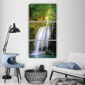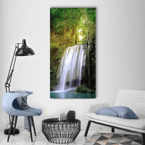 A serene waterfall tucked in a lush green forest, with sunlight filtering through trees and water flowing over rocks. This peaceful landscape brings a calm, nature-inspired presence to living rooms or bedrooms seeking soft, leafy accents.