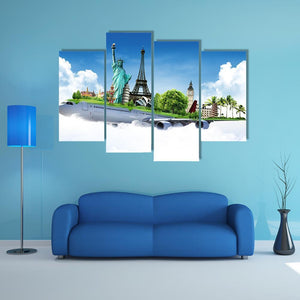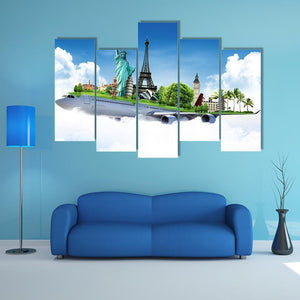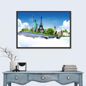 This captivating canvas art invites you to explore the world from the sky. Featuring an airplane soaring above iconic landmarks like the Eiffel Tower and Statue of Liberty, it evokes a dreamlike and adventurous atmosphere. It's a perfect addition to any modern space.