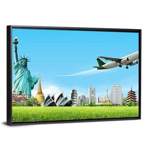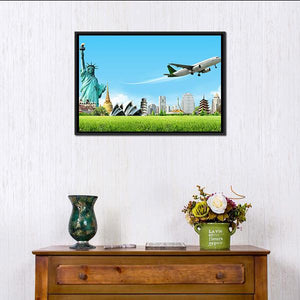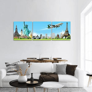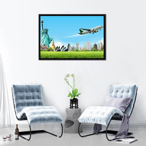 This photo-realistic panoramic canvas gathers world landmarks—Statue of Liberty, the Eiffel Tower and other global icons—with an airplane crossing a clear daytime sky. Rendered in blues, greens, white and brown, it carries a travel mood and suits room decor like living rooms, offices, or travel-themed spaces.