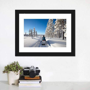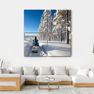This canvas artwork captures the serene beauty of a snowy forest in Finnish Lapland, featuring a snowmobile rider amidst snow-covered trees. The adventurous spirit and cold atmosphere bring a touch of winter magic to your space.