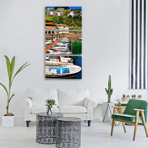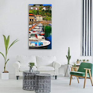 This canvas shows boats docked in a harbor with buildings rising on a hillside and reflections in the water. The realistic scene reads vibrant and sunny yet serene, suited to coastal or modern room decor.