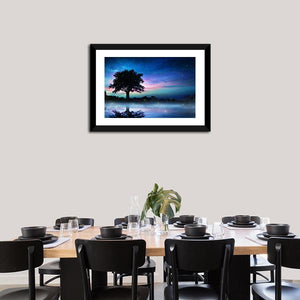 This canvas art depicts a serene tree under a dreamy night sky, reflecting beautifully on a calm lake. The vibrant palette of blues, purples, and pinks creates a magical atmosphere, making it a captivating piece for your home decor.