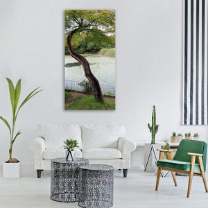 Tree Leaves With Lake Canvas Wall Art shows a quiet lakeside scene with a curving tree trunk, lily pads on the water, and a white fence framed by green and brown foliage. Rendered in a naturalistic, rule-of-thirds composition with soft greens, browns, whites and greys, it creates a peaceful, calm atmosphere. It suits nature-inspired and modern interiors.