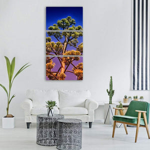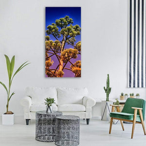 A tree beneath a clear blue sky shares the frame with a close-up bloom stalk and clusters of yellow flowers. The image leans toward stylized realism, using green, yellow, purple, and blue for a vibrant, dramatic mood. Works well in modern or nature-inspired rooms.