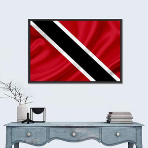 A bold, vibrant depiction of the Trinidad & Tobago flag, shown diagonally with a draped fabric texture that emphasizes motion and pride. This modern canvas print brings nationalistic energy to contemporary room decor and house interiors.