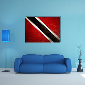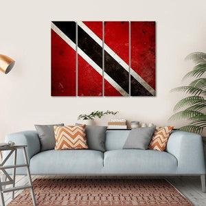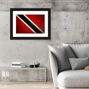 Show your pride with this Trinidad & Tobago flag artwork. Its bold red background features a striking diagonal black band bordered by white, creating a patriotic and dynamic piece perfect for any wall decor.