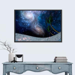 A surreal, dreamy underwater night scene where a spiral galaxy hangs above the ocean and two leaning palm trees on a beach. Rendered in blue, purple, green and pink with layered depth and a rule-of-thirds composition, this modern abstract canvas fits modern or coastal-inspired rooms.
