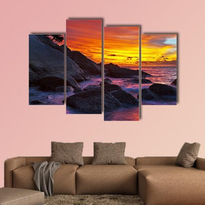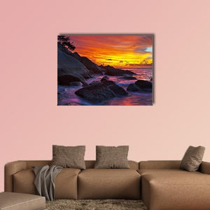 A photo-realistic view of a rocky shore and ocean sunset, with rippling water, a tree on the upper-left rocks, and a silhouetted figure standing on the rocks. Warm oranges and yellows mix with purple and blue to create a serene, dramatic, and colorful atmosphere. Suited to modern or coastal rooms that want a calm, nature-focused focal piece.