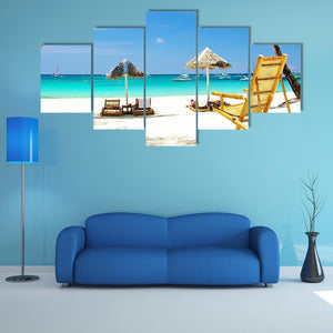 This canvas artwork captures a serene beach scene with palm trees, lounge chairs, and colorful umbrellas. The vibrant palette of blue, white, and green creates a relaxing tropical atmosphere, perfect for brightening up any space.