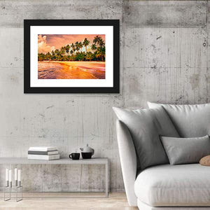 This vibrant canvas art captures a tranquil beach scene at sunset, featuring swaying palm trees and gentle waves lapping the shore. With its warm palette of orange, pink, and green, it brings a peaceful and idyllic atmosphere to any space.