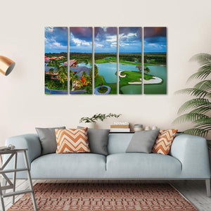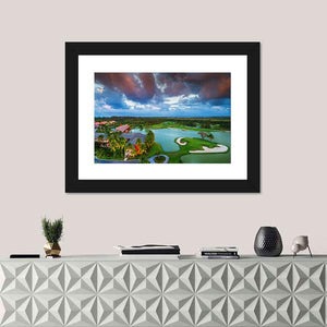 This canvas art captures a serene golf course in the Dominican Republic, framed by vibrant tropical vegetation and a picturesque lake. The dramatic sky enhances the luxurious feel of the scene, inviting a sense of calm and beauty to any space.