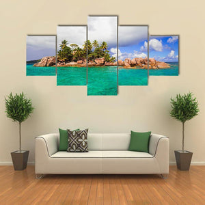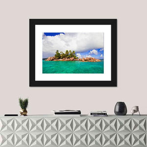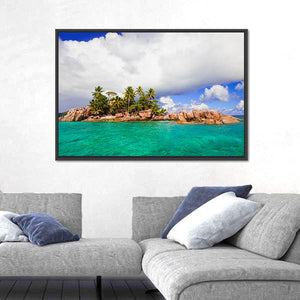 Tropical Island At Seychelles Canvas Wall Art presents a realistic island scene with clear turquoise water, lush green palm trees and reddish-brown boulders beneath fluffy white clouds. The image feels serene and idyllic and suits coastal or modern room decor. It brings a calm tropical mood to living rooms or bedrooms.