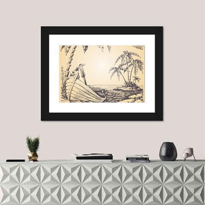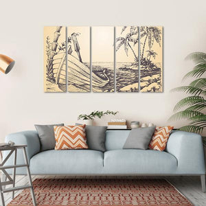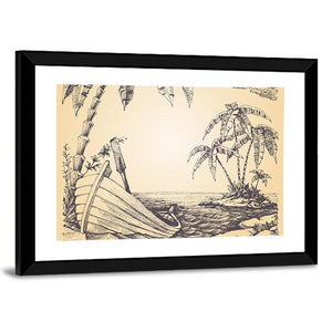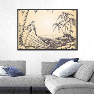 This canvas wall art captures a serene tropical scene featuring a boat near a beach surrounded by palm trees. The vintage sepia tone and hand-drawn sketch style create a tranquil atmosphere, making it a lovely addition to any room decor.