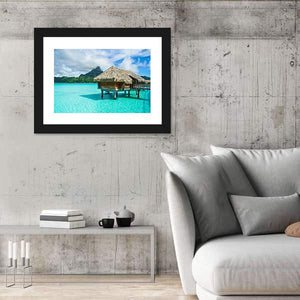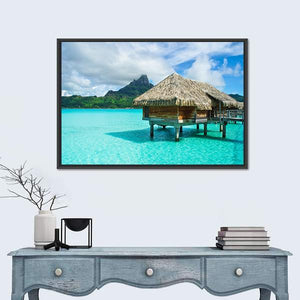 A panoramic, photorealistic canvas of overwater thatched-roof bungalows set above clear turquoise water, with a pier and a distant mountain under a bright sky. The serene, idyllic tropical scene works well in island-inspired rooms and brings a calm, beachlike mood to living spaces.