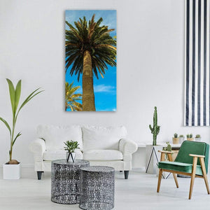 A photorealistic palm tree reaches up into a clear blue sky, with feathery fronds and a bright, tropical, serene mood. The vibrant scene fits coastal or modern room decor that wants a calm nature focal point.