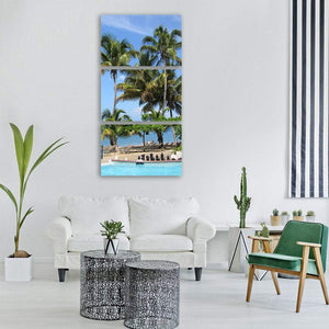 Photorealistic palm trees frame a clear-blue swimming pool with the ocean beyond, creating a calm, tropical scene. The rule-of-thirds composition and blue-green palette keep the view relaxed and balanced, while lounge chairs add a quiet, restful detail. Works well in beach, modern, or nature-inspired rooms.