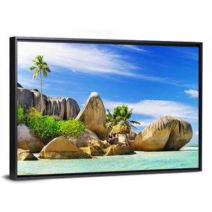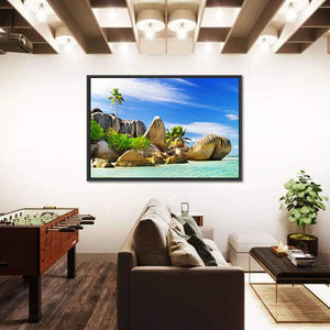 A realistic landscape of a tropical beach with granite boulders, palm trees and turquoise ocean beneath a clear blue sky with wispy clouds. The palette of blue, green, brown and white creates a serene, calm mood. It works well in modern living spaces as room decor.