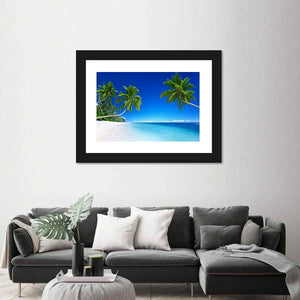 Tropical Paradise Canvas Wall Art depicts a sunlit beach scene with palm trees, white sand, and clear turquoise water for a relaxed, tropical mood. The image uses a rule-of-thirds composition and fits modern home room decor.
