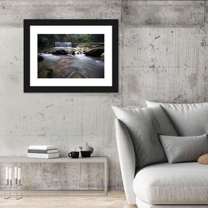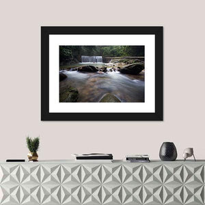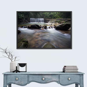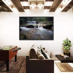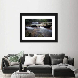 A realistic landscape print of a tropical rainforest waterfall, showing river rocks and dense forest with a long-exposure effect on the flowing water. The calm palette of greens, browns, whites and grays creates a peaceful, natural atmosphere that works well in modern or nature-inspired rooms.