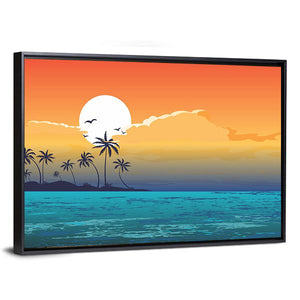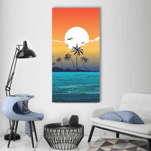 A stylized tropical beach scene with silhouette palm trees, a circular sun, and calm ocean waves in a warm orange, yellow, blue and green palette. The composition feels calm and serene with a modern, minimalist approach. Suited to beach-inspired or tropical rooms as a relaxed, contemporary focal point for room decor.