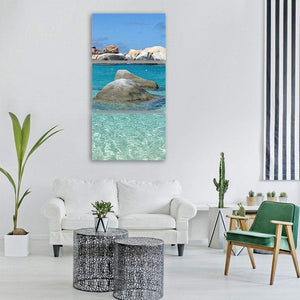 This realistic seascape features clear turquoise water, smooth rounded rocks, and sunlight dappling across ocean boulders. Its serene, refreshing mood and sense of depth make it a calm focal piece for coastal or modern interiors like living rooms and bedrooms.