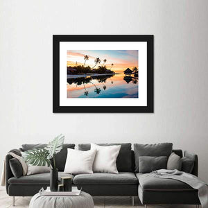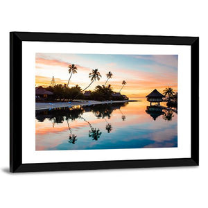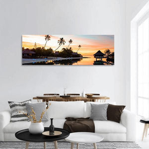 Tropical Sunset at Moorea captures a photo-realistic tropical beach with overwater bungalows, palm trees, and a glowing sunset sky reflected in calm water. The wide panoramic view and warm orange-pink to cool blue-green palette give a serene, tranquil mood that fits coastal, modern, or relaxed living spaces.