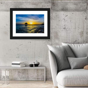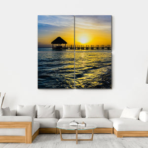 Bring the serene beauty of a Caribbean sunset to your space with this canvas art featuring a tranquil view of a pier and a thatched roof hut. The warm palette of blues, yellows, and oranges reflects a peaceful coastal scene that adds warmth and calm to any room.