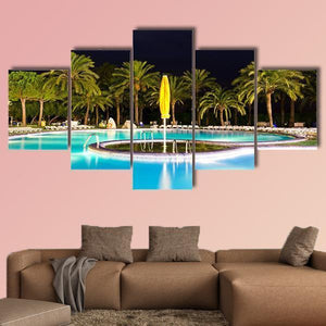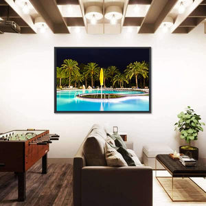 This photorealistic canvas shows a nighttime tropical swimming pool with illuminated turquoise water, palm trees, and a single umbrella in a wide-angle view. Cool blues, greens, and touches of yellow and black create a relaxed, tropical mood that fits modern living rooms, entryways, or poolside-themed room decor.