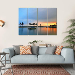 This canvas art captures a serene ocean sunset with graceful palm trees and a small boat anchored peacefully in calm waters. The rich palette of blue, orange, green, and gray creates a tranquil atmosphere, making it an ideal piece for enhancing any nature-inspired decor.