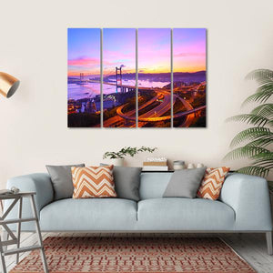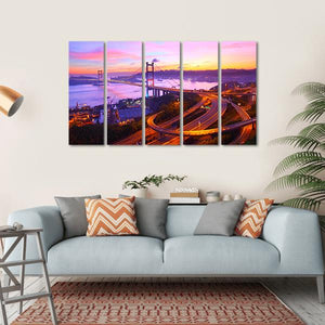 Capture the beauty of Hong Kong with this vibrant canvas depicting the Tsing Ma Bridge at sunset. The photorealistic artwork features a serene dusk sky filled with clouds, over a cityscape of winding roads illuminated by headlights. Ideal for adding a touch of modern elegance to your space.