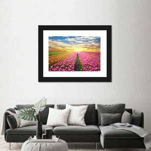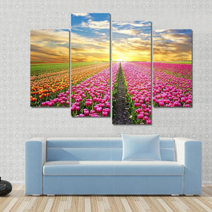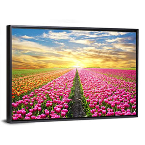 This vibrant canvas captures a serene tulip field at sunrise, with rows of pink and orange flowers leading to a dramatic cloudy sky. A perfect piece to bring nature's beauty into your space.