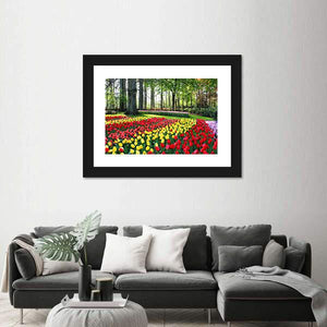 This vibrant canvas art showcases rows of red and yellow tulips, complemented by tall trees in the background. Capturing the serene essence of springtime, it's a beautiful addition to any nature-inspired décor.