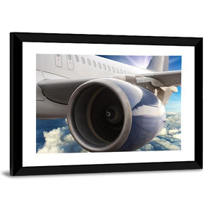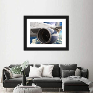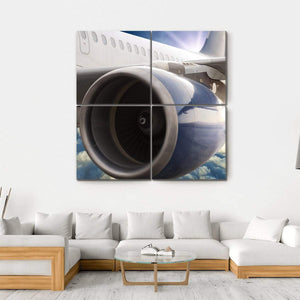 This canvas art features a close-up of an airplane engine, showcasing the fan blades against a serene sky with clouds. The striking blue, gray, and yellow palette evokes feelings of power and awe, making it a captivating addition to any aviation enthusiast's decor.