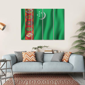Celebrate Turkmenistan's rich heritage with this vibrant canvas wall art featuring the national flag. Centered in the artwork, the green field, bold red stripe with a traditional carpet pattern, white crescent moon, and five stars evoke a sense of patriotism and cultural pride.