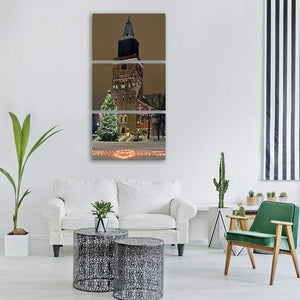 Turku Cathedral in Finland appears centered in a winter night scene, its church tower set among snow with an illuminated Christmas tree and decorative lights. Brown, green, white and gold tones lend a festive yet solemn mood, making this canvas a natural fit for modern room decor or seasonal displays.