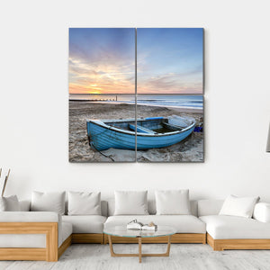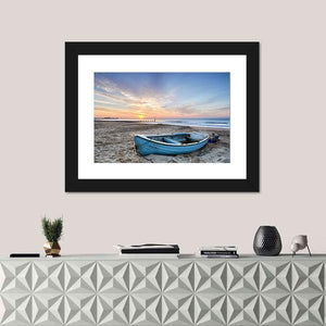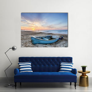 This canvas art captures a serene scene of a blue rowboat resting on the sand as calm ocean waves lap at the shore under a beautiful sunset sky. The tranquil palette of turquoise, orange, and yellow evokes a peaceful beach atmosphere, perfect for bringing a touch of nature indoors.