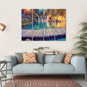 This canvas wall art captures the serene beauty of Plitvice Lakes, featuring a vibrant palette of turquoise water, lush green trees, and warm golden sunlight filtering through branches. With realistic details and reflections on the water, it brings a peaceful atmosphere to any space.