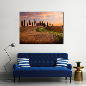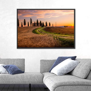 This canvas features a serene Tuscan landscape, showcasing cypress trees, a quaint farmhouse, and a winding dirt road through a golden wheat field. The tranquil hues of brown, green, and soft clouds evoke a peaceful golden hour, perfect for enhancing any space.
