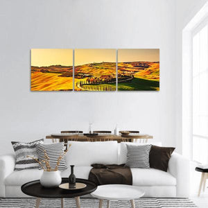 Crete Senesi, Tuscany Panoramic Canvas shows rolling hills, cypress trees and a sunlit villa in late-afternoon light. The photorealistic panorama in gold, green and brown tones feels serene and warm, a peaceful focal point for living rooms, dining areas, or an office.
