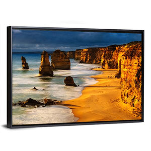 This canvas shows the Twelve Apostles in Australia at sunset, with sunlit coastal cliffs and rock formations beside long-exposure ocean water. Golden yellow and aqua meet deep blue and grey to create a dramatic, rustic coastal mood that suits coastal, rustic, or modern room decor.