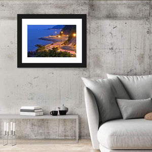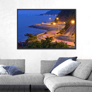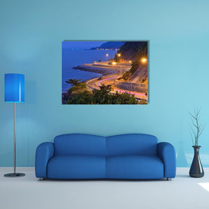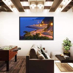 This canvas captures a coastal road at twilight with the ocean on the left and a hillside on the right from an aerial viewpoint. Headlights and light trails trace the winding road beneath streetlights, blending blue and orange tones into a dynamic yet serene night scene that suits modern living rooms or hallways.
