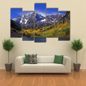 This canvas art features the stunning Maroon Bells mountains reflected in a tranquil lake, surrounded by vibrant autumn trees. Its serene and majestic atmosphere makes it a beautiful addition to your home decor.