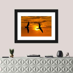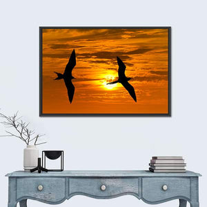 This canvas art features a striking silhouette of two birds flying against a vibrant sunset backdrop. The dramatic hues of orange and yellow against the dark sky evoke a serene and hopeful atmosphere, making it a beautiful addition to any modern space.
