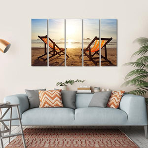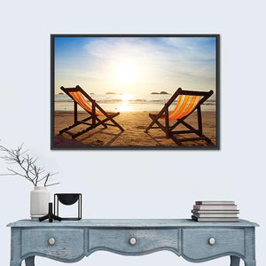 This canvas art captures a serene beach scene with two empty lounge chairs facing the ocean at sunset. The calming palette of blues, oranges, and tans invites a peaceful vacation vibe into your space.