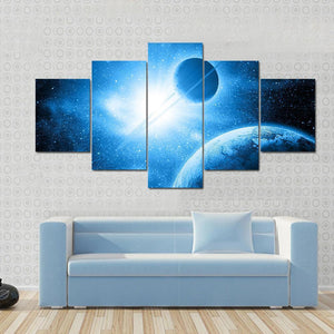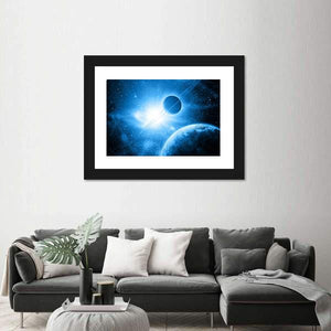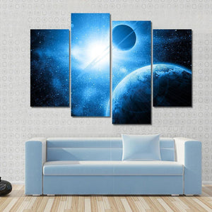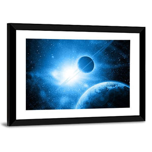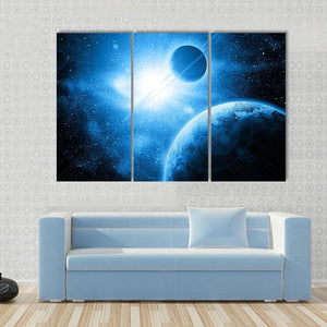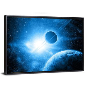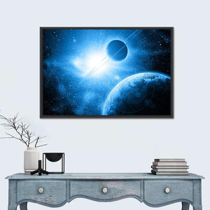 This canvas art features a cosmic scene with two planets, a glowing sun, and textured elements that evoke a sense of mystery. The abstract style and deep space theme make it a captivating addition to any modern decor.