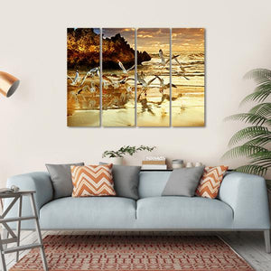 This stunning canvas art captures the serene beauty of Two Rocks in Perth, Australia. Featuring vibrant reflections on wet sand, dynamic seagulls in flight, and dramatic rock formations, it brings a touch of the coastal landscape into your space.
